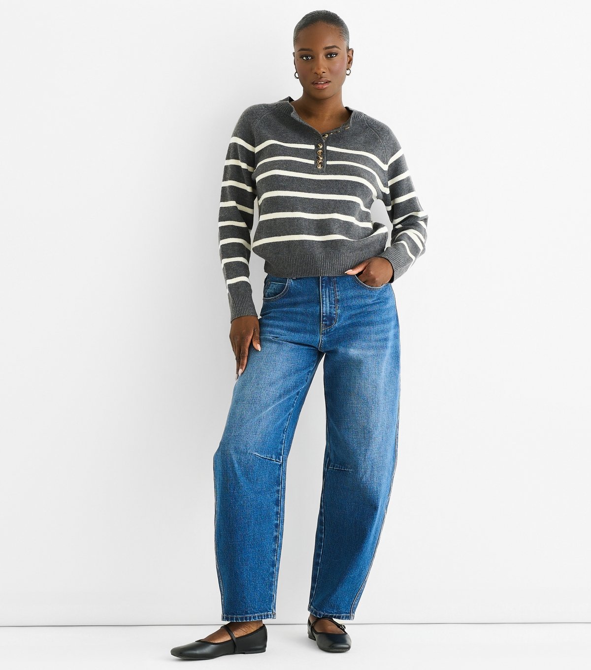 Timeless grey striped jumper with a button front and ribbed trims. Ideal for cooler weather, this piece features a relaxed fit and a henley neckline.
