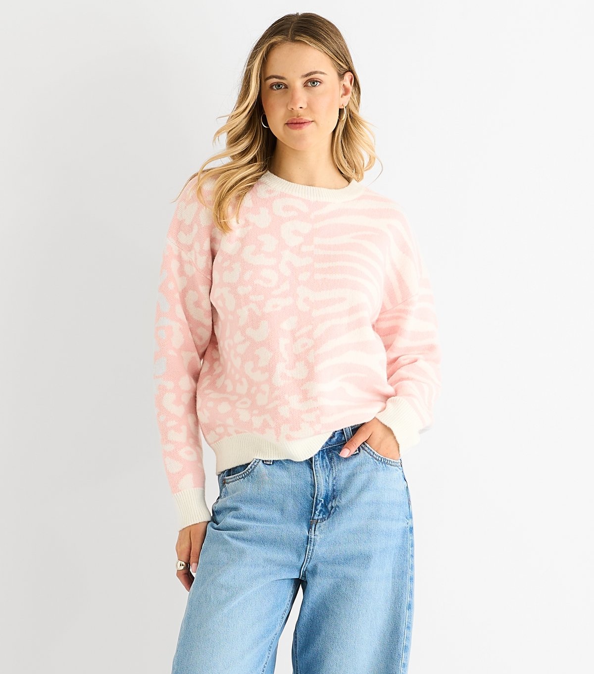 Trendy pink zebra patterned jumper by Gini London. Featuring a relaxed fit and long sleeves, this jumper is perfect for casual wear. The contrast ribbed trims add a stylish touch.