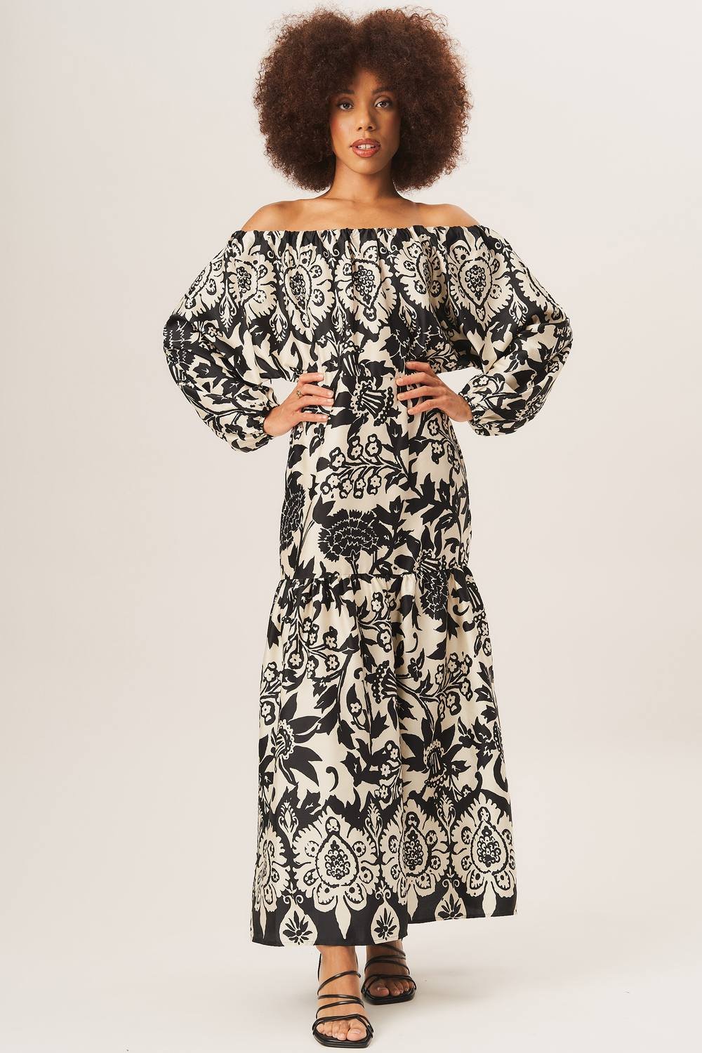 Effortlessly chic mono border print maxi dress with a flattering bardot neckline. Perfect for any occasion, this dress showcases a unique style with its stunning floral design.
