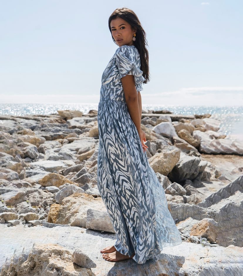 The Gini London Blue Metallic Print Maxi Dress is ideal for evening, date-night, party.