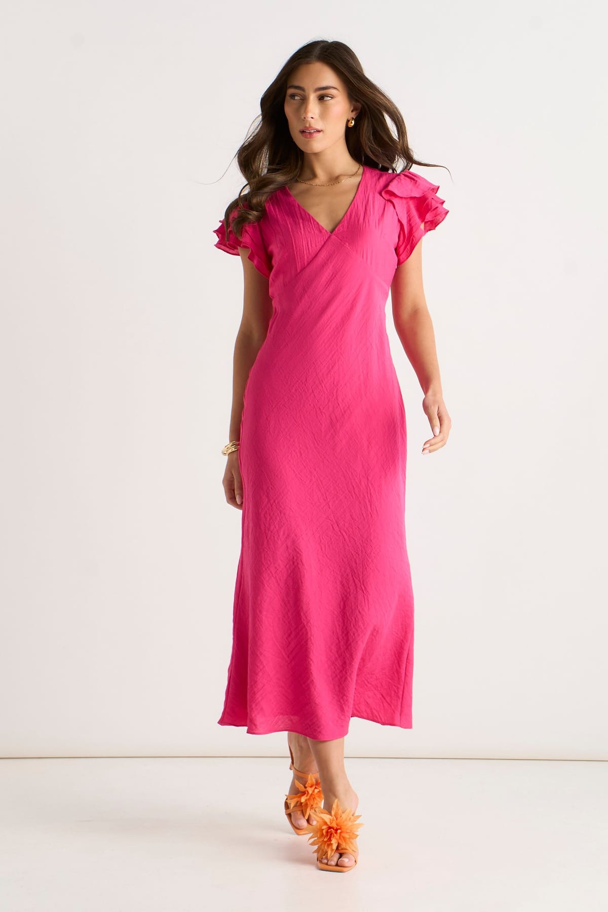 Charming pink midi dress with a V-neckline and delicate ruffle detailing along the bias cut. The soft pink hue complements a range of skin tones. Perfect for spring and versatile for both casual and occasion wear.