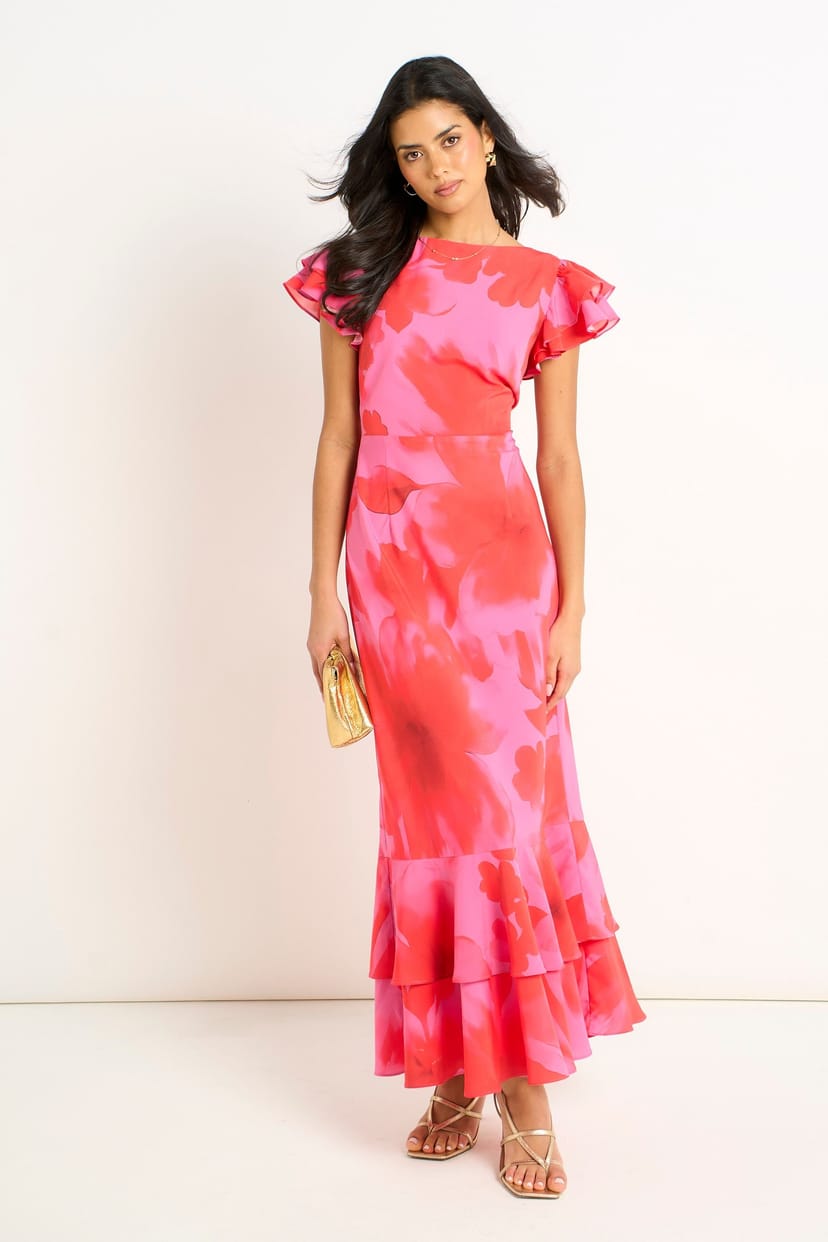 The Gini London Pink Floral Print Ruffle Midi Dress is available in sizes 10, 12, 14, 16, 8.