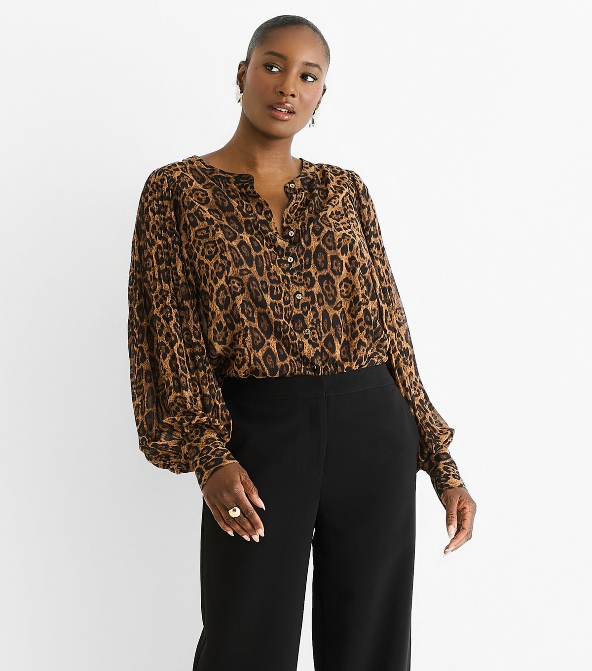 Stylish brown leopard print blouse by Gini London. Made from lightweight chiffon, it features a round neckline and long puff sleeves with fitted button cuffs. The button-front fastening adds a classic touch. Ideal for casual and evening wear.