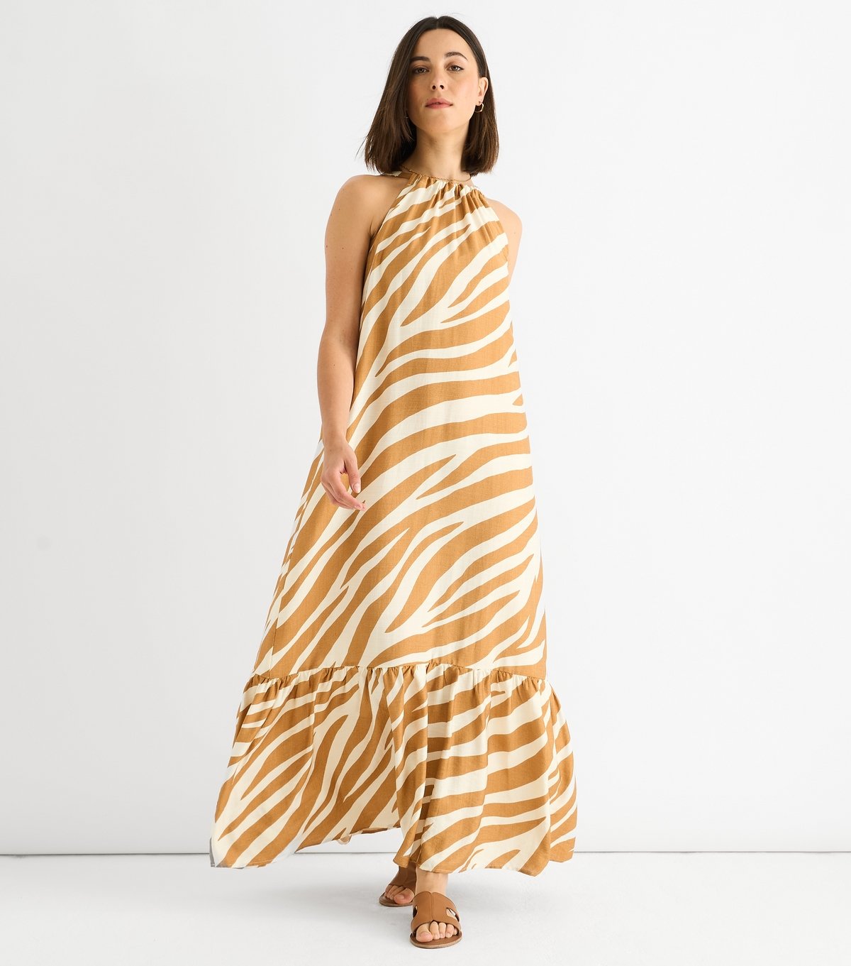 Stylish maxi dress in brown and cream zebra print featuring a high halterneck and tiered hem. Made from woven fabric for a relaxed fit. Ideal for beach parties or summer outings.