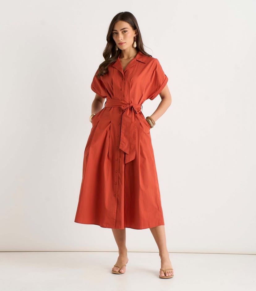 This rust cotton midi shirt dress from Gini London features a relaxed yet structured fit, perfect for sunny days. It boasts short grown-on sleeves and a long A-line skirt with a tie belt for adjustable fit.