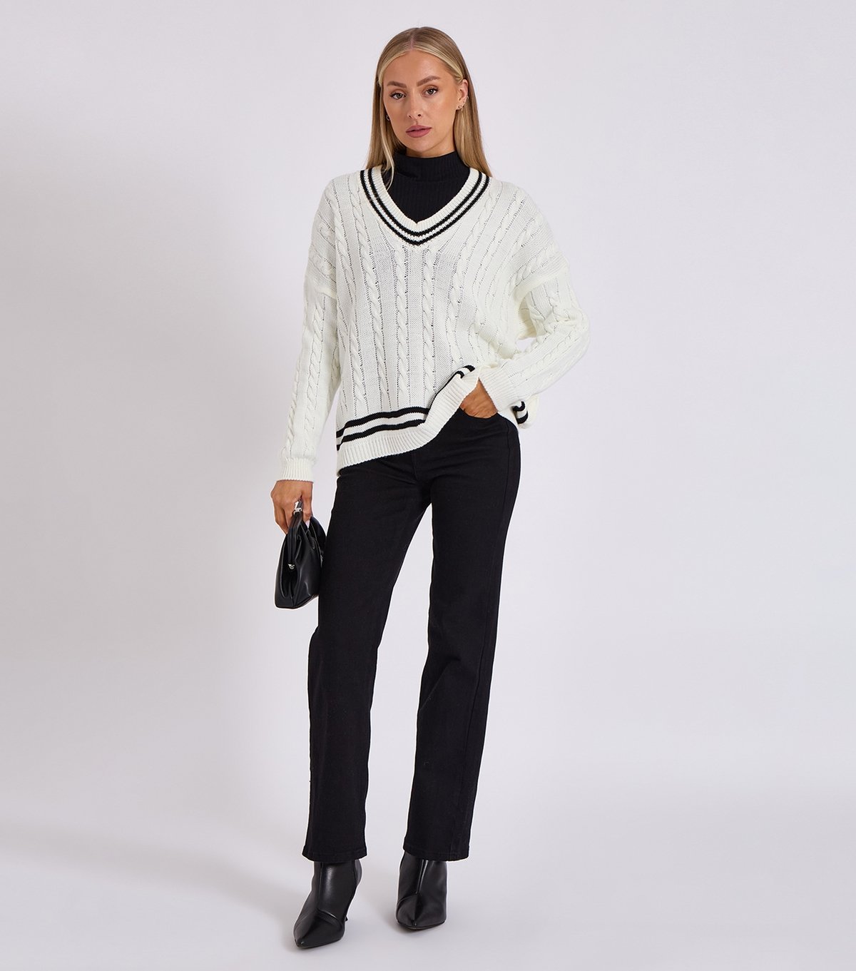 Stylish cable knit jumper in white with contrast stripes. Features a V-neckline and long sleeves. Ideal for a relaxed fit and casual occasions.
