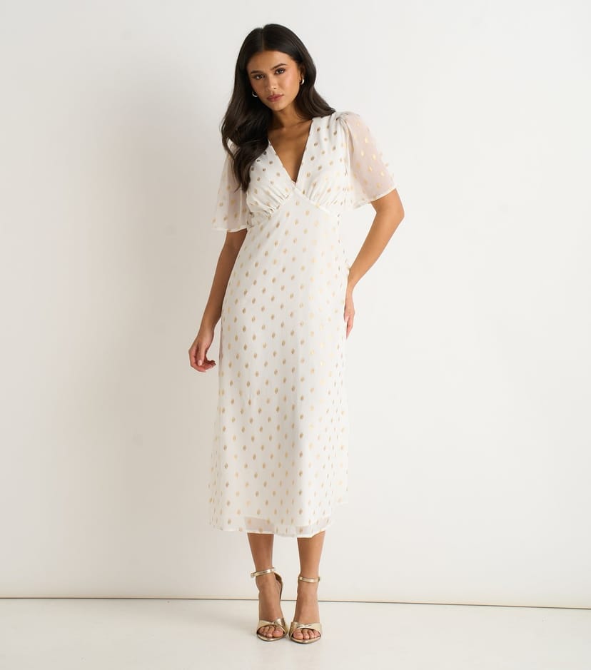 Elegant white midi dress from Gini London featuring a foiled gold pattern that catches the light beautifully. The flowy sleeves and flattering V-neckline make it perfect for weddings or garden parties.