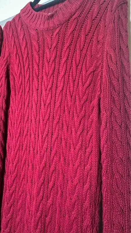 Rich burgundy knit set by Glamify. Includes a long-sleeve cable knit maxi dress and a matching long cardigan. Perfect for cooler weather with its warm, textured fabric.
