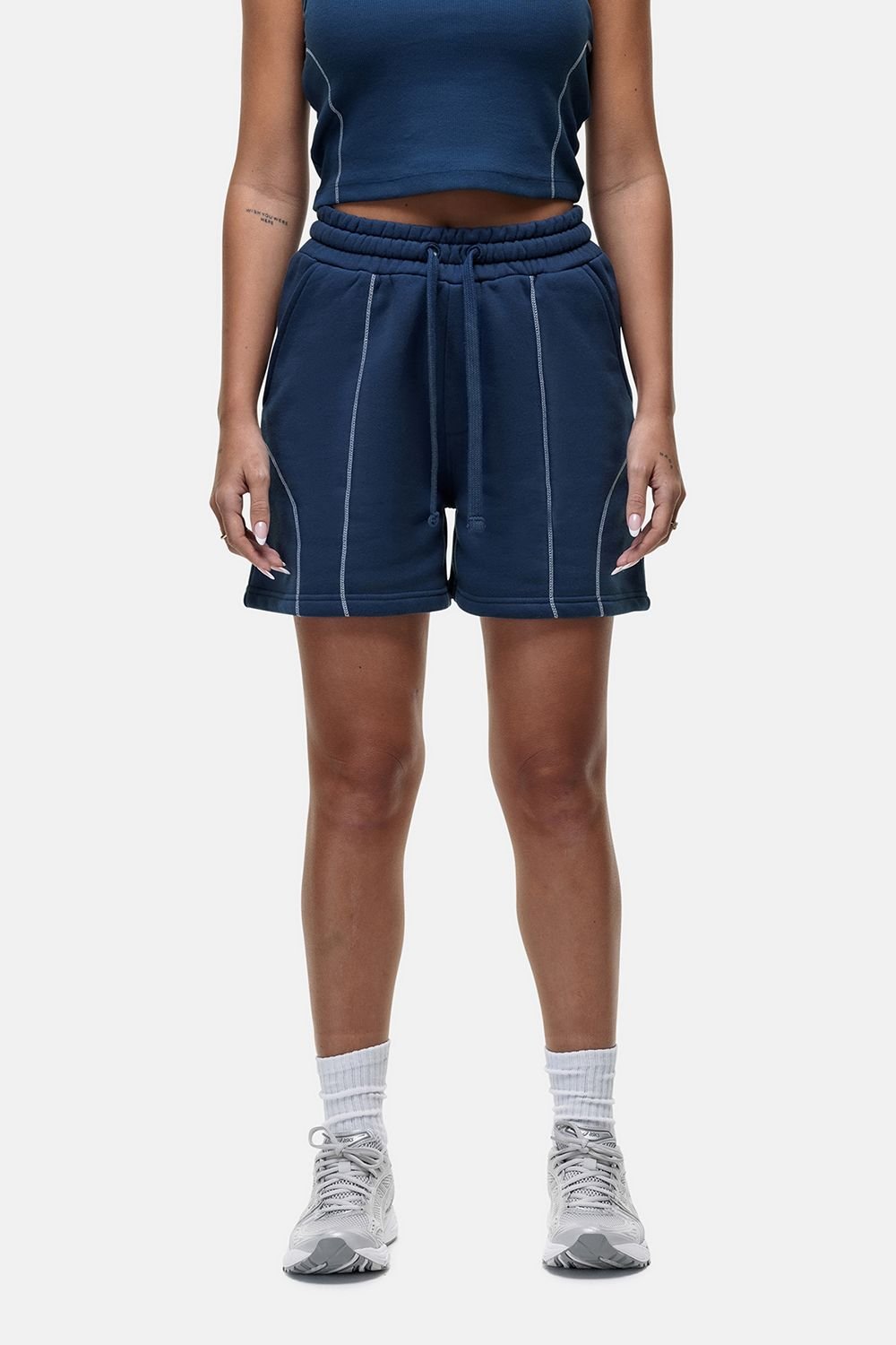 Stylish vintage shorts in blue fleece with a relaxed jogger fit. Featuring contrast piping and a chunky drawstring waist, these shorts are perfect for casual outings.