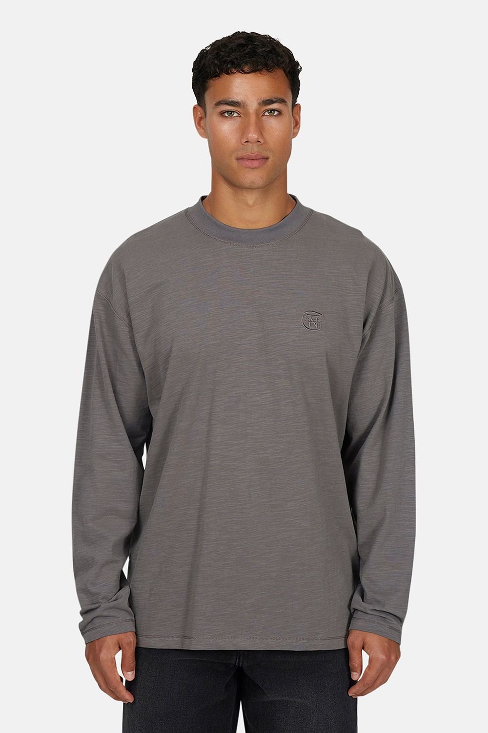 Stylish long sleeve t-shirt in dark grey from Good For Nothing. Made from slub cotton jersey, it offers a textured finish and a relaxed fit. Features a subtle embroidered emblem for a clean look, perfect for everyday wear.