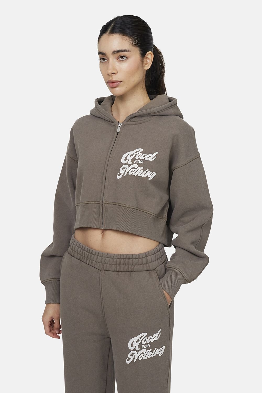 Elevate your casual wardrobe with this cropped zip-through hoodie from Good For Nothing. Made from a soft brushed back fleece, it offers ultimate comfort with a modern cropped fit. Featuring a bold puff print logo, ribbed hem and cuffs, and a full zip front, perfect for layering with your everyday outfits.