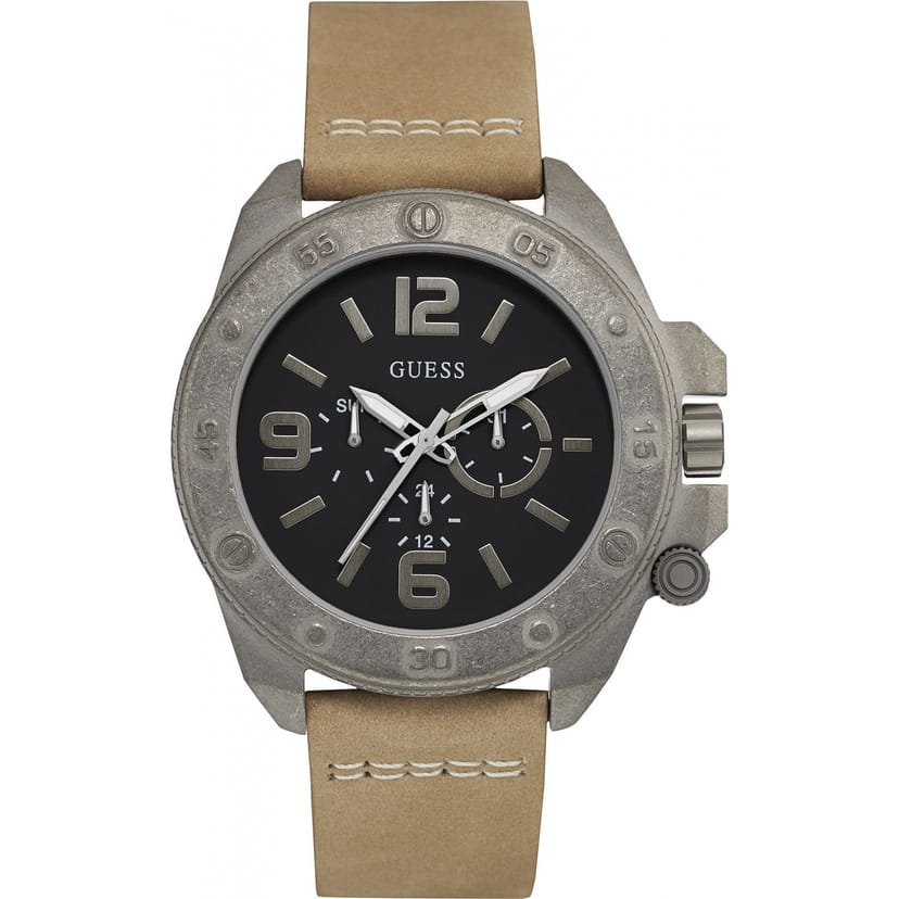 Stylish Guess W0659G4 men's watch in beige with a black dial and silver-tone accents. Features a leather strap and quartz movement for precision. Ideal for everyday wear.