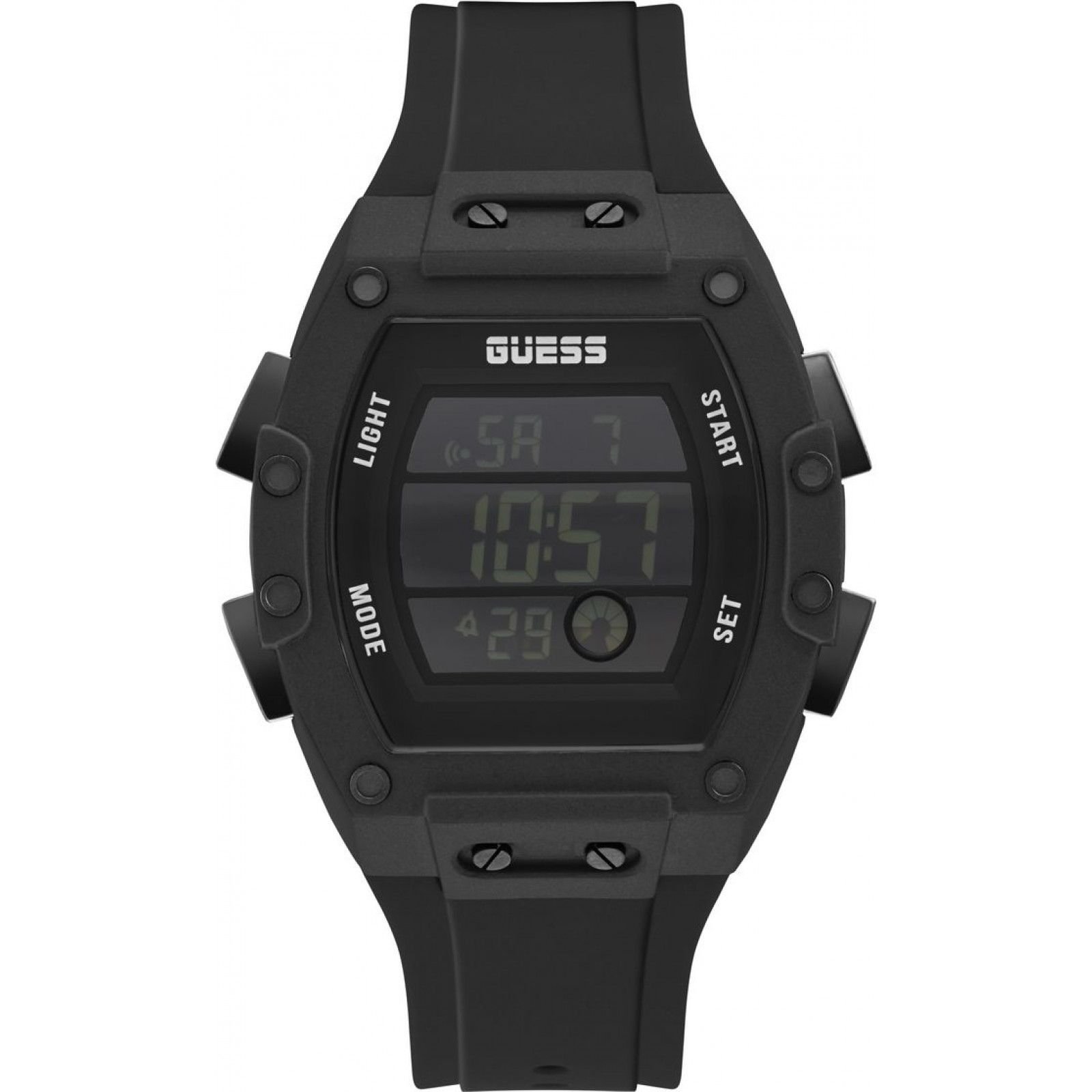 Stylish black digital watch from Guess with a square face and digital display. Features a black rubber strap and a black metal case. Perfect for everyday wear with its durable design and easy-to-read display.