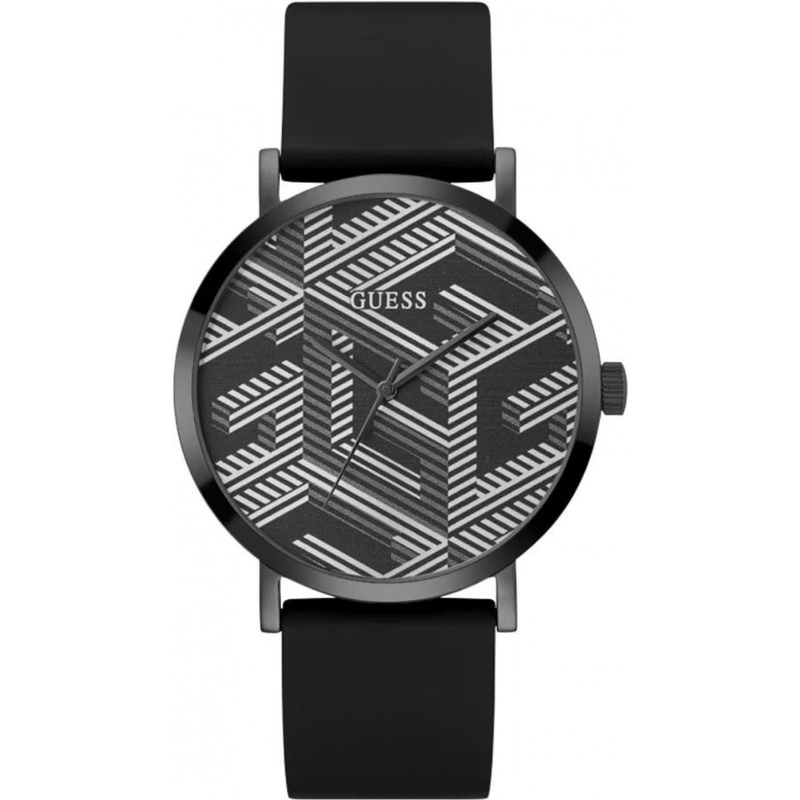Stylish black quartz watch from Guess, featuring a geometric dial pattern and a black rubber strap. Ideal for everyday wear and special occasions.