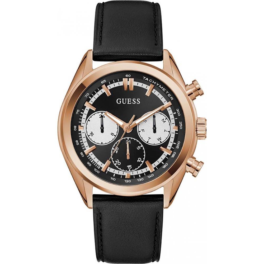 Stylish Guess Men's GW0972G4 dress watch in black with a rose gold-tone case and black leather strap. Features a black dial with silver accents and date display.
