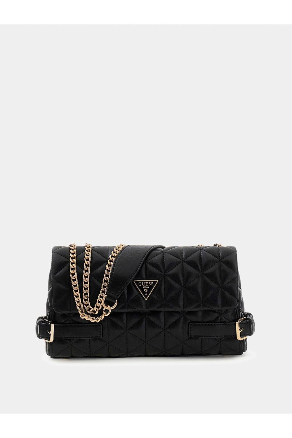 Stylish convertible crossbody bag from Guess in black quilted leather. Features a geometric triangular pattern and a gold-tone chain strap with an adjustable leather shoulder section. The signature Guess triangle logo is prominently displayed.