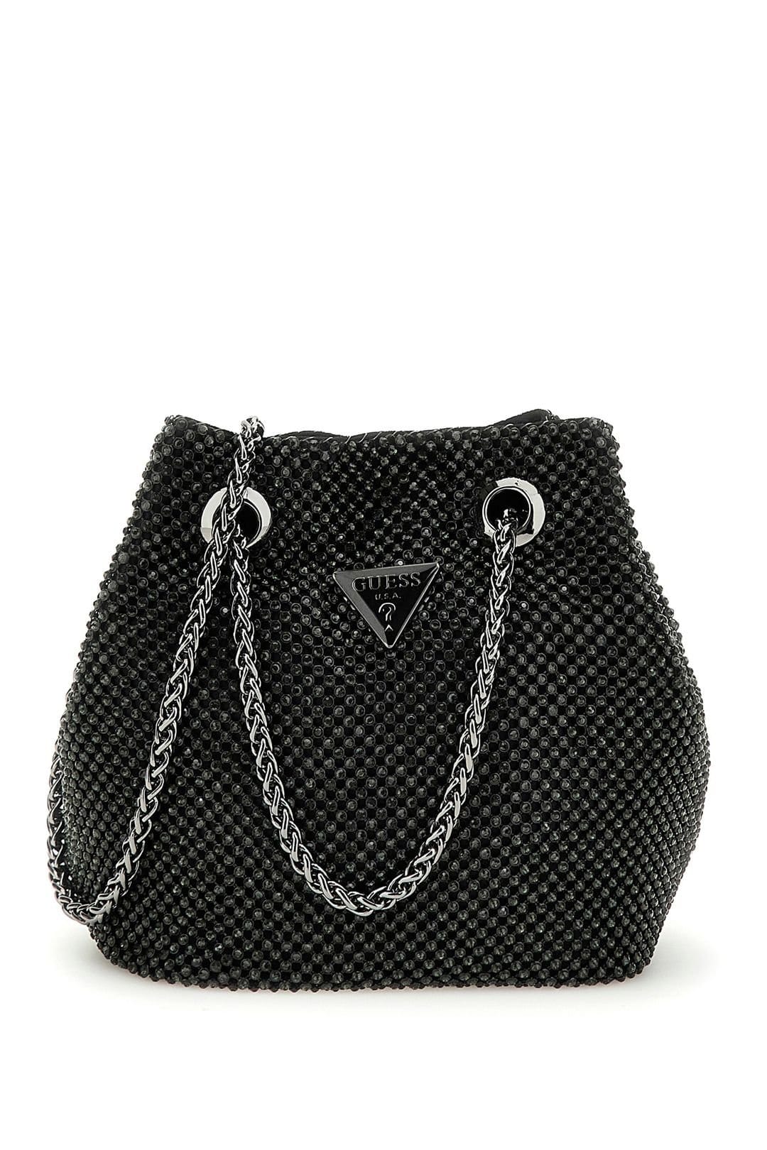 Elegant black beaded pouch with a textured surface and silver-tone chain handles. Features an iconic triangular Guess logo on the front. Compact yet spacious, perfect for daily essentials.