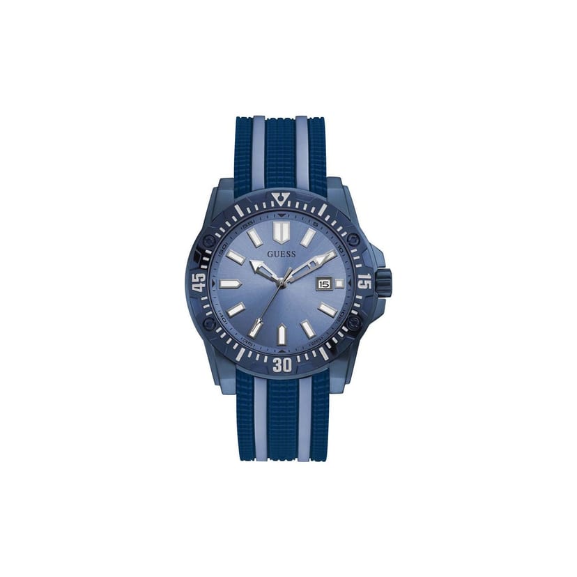 Modern blue sports watch from Guess with a silver-tone bezel and blue rubber strap. Features a combination of analog and digital elements on the dial, suitable for various activities.