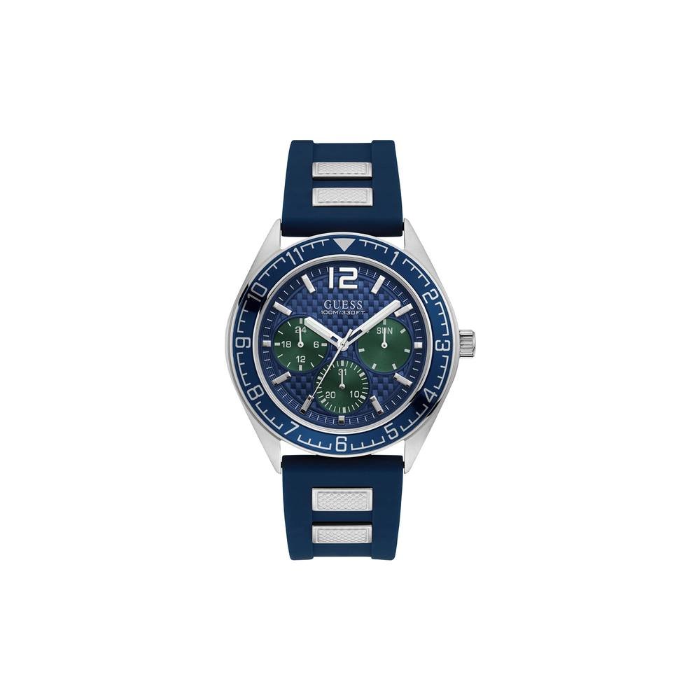 Stylish blue dial and blue strap Guess watch with a quartz movement. Features a silver-tone case and green sub-dials for a modern look. Ideal for casual and everyday wear.