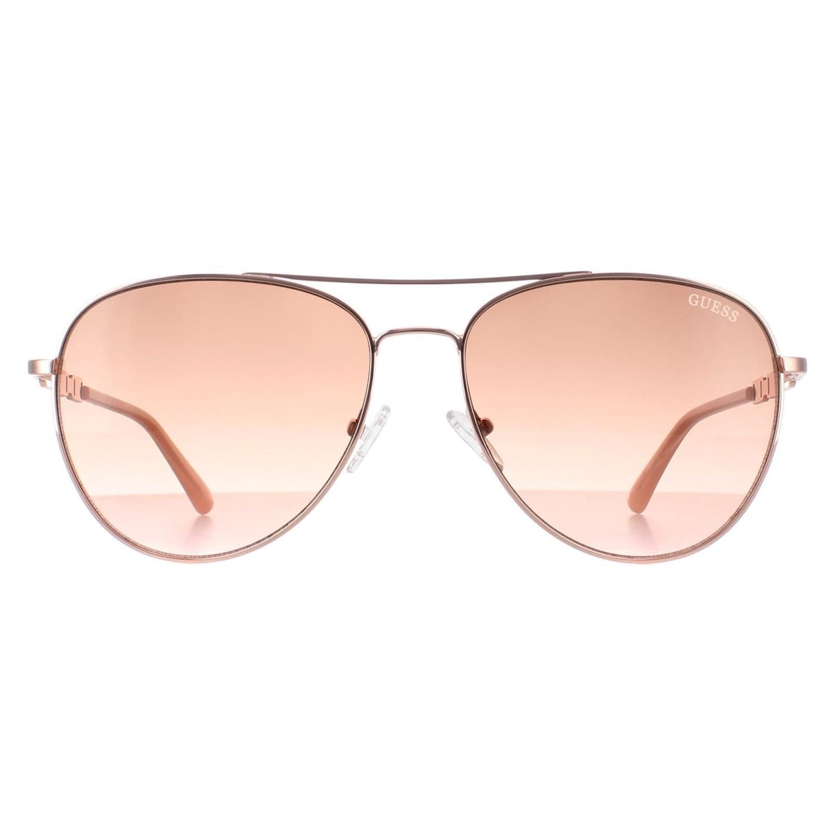 The Guess Women's Aviator Shiny Rose Gold Brown Gradient Sunglasses is made from metal.