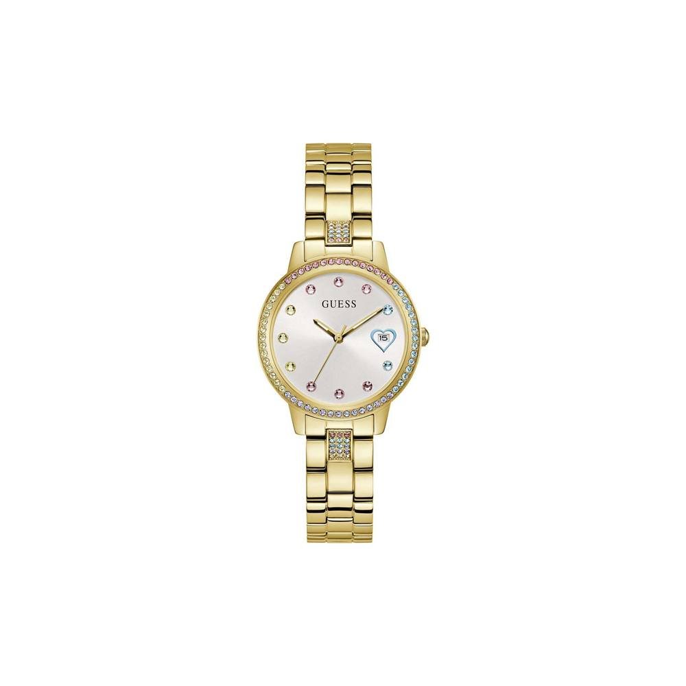Elegant gold quartz watch from Guess, featuring a white dial adorned with multi-colored crystals and a heart-shaped accent at the 12 o'clock position. The gold-tone metal bracelet adds a touch of sophistication.