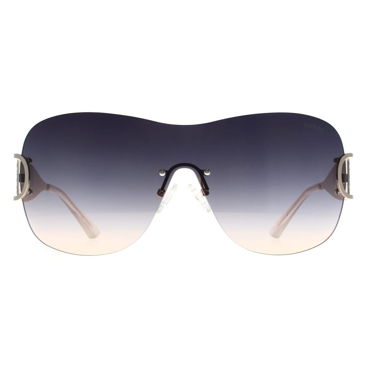 Modern Guess Shield Gold Smoke Gradient sunglasses with a sleek, contemporary design. The acetate frame offers comfort and durability, while the metal temple accents and Guess logo add a polished touch. Ideal for everyday wear.