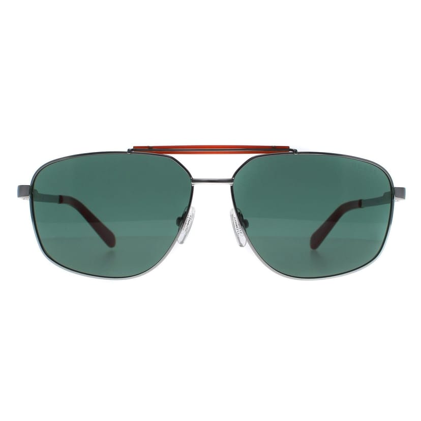 Sleek aviator sunglasses in shiny gunmetal green with green lenses. Crafted from high-quality metal for durability and lightweight wear. Features a double bridge and Guess logo on the temples.