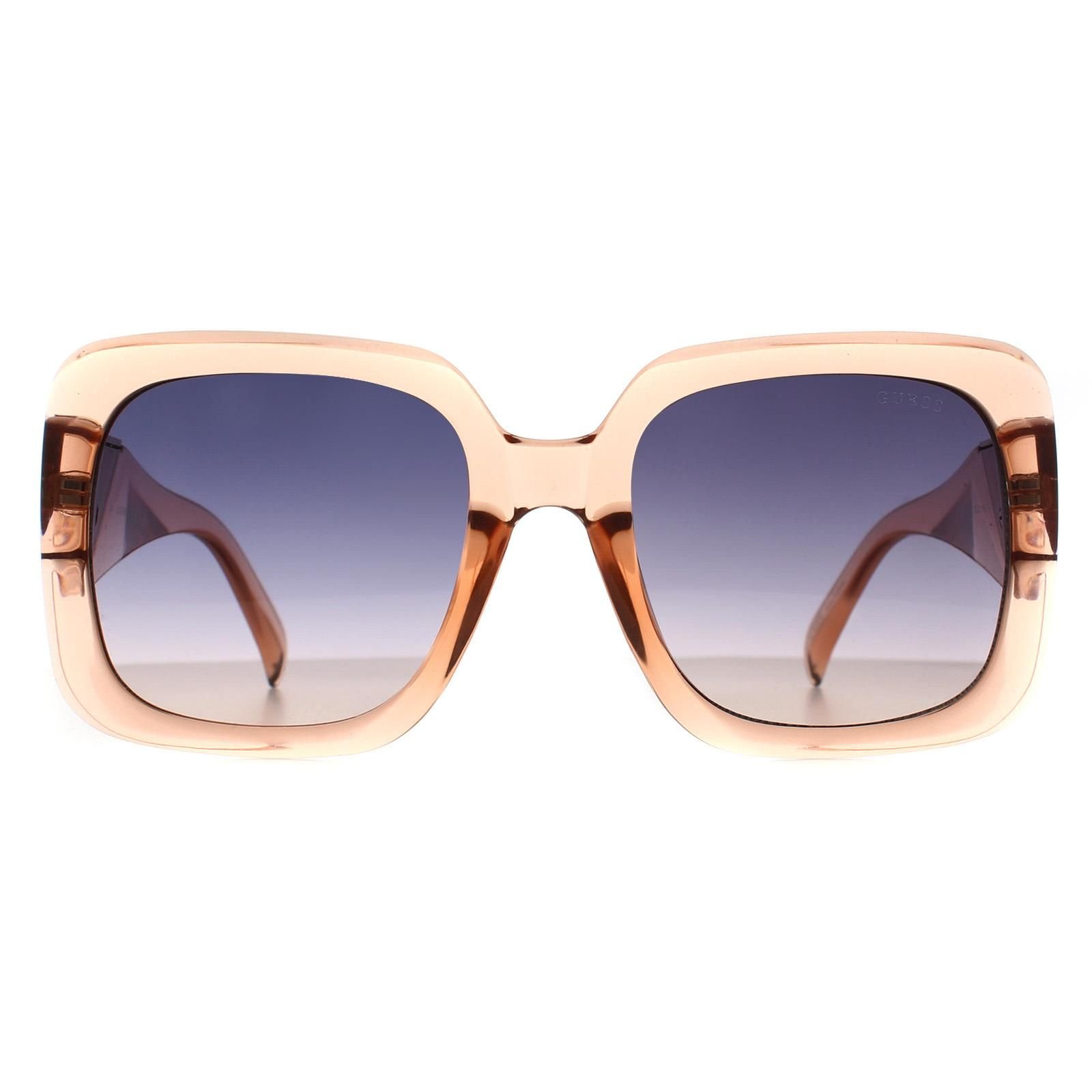 Contemporary square-shaped sunglasses with a light brown smoke grey gradient frame. Crafted from acetate, these sunglasses feature sleek, polished metal accents for a refined look. Designed for comfort and everyday wear, the lightweight frame ensures a secure fit, while the signature Guess logo on the temples adds a subtle touch.