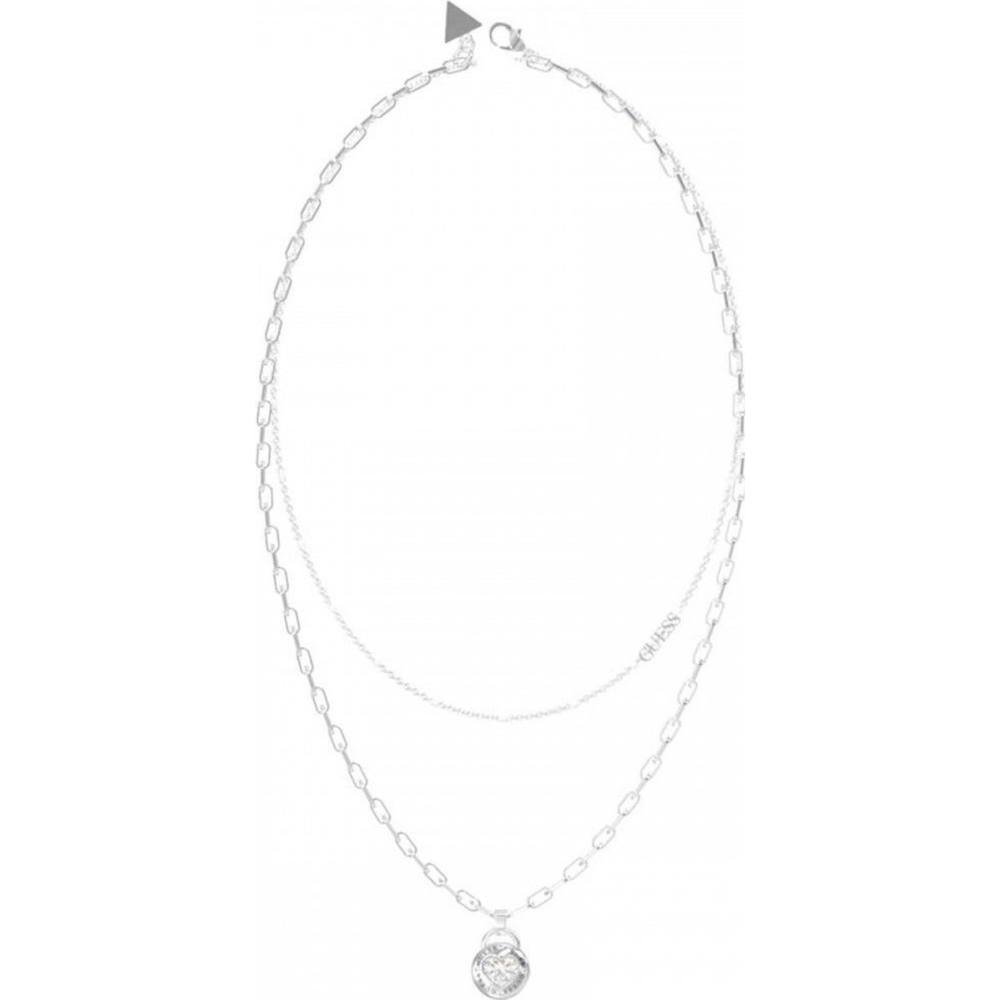This Guess necklace features a layered design with a shorter chain and a heart pendant. Crafted from silver-plated metal, it adds a touch of elegance to any outfit. Perfect for everyday wear or special occasions.