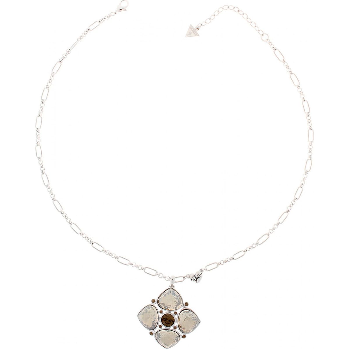 This Guess necklace features a silver chain with a crystal pendant. The pendant has a four-petal design with clear and brown crystals. Ideal for evening wear or special occasions.