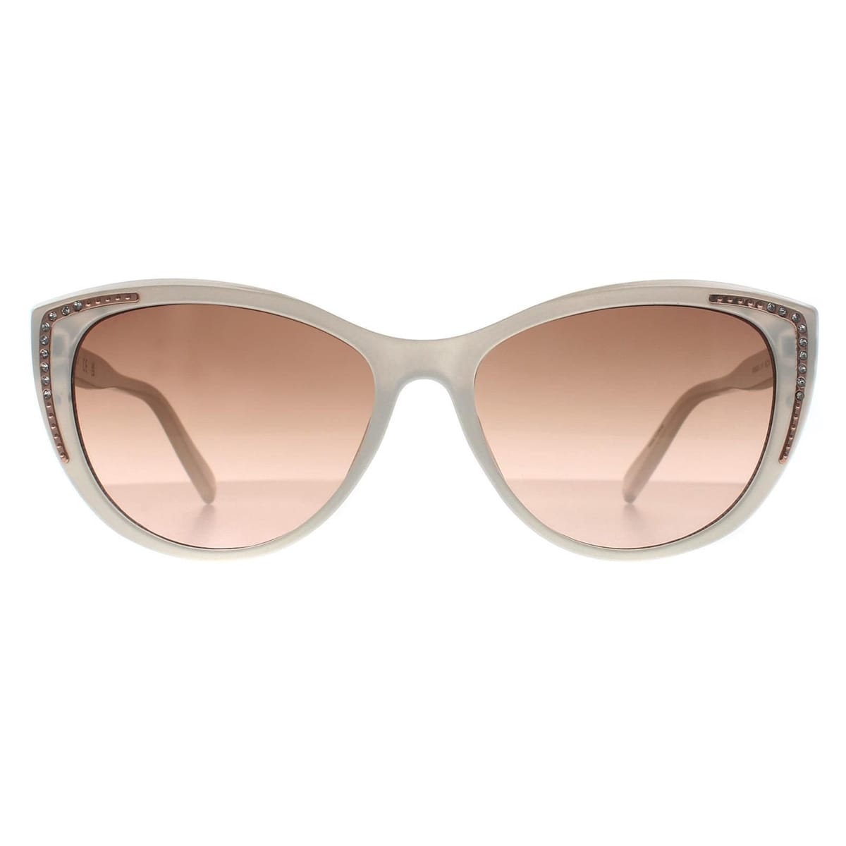Stylish cat-eye sunglasses from Guess featuring a white and brown gradient frame with pink-tinted lenses. Adorned with decorative crystals, these sunglasses add a touch of glamour to any outfit.