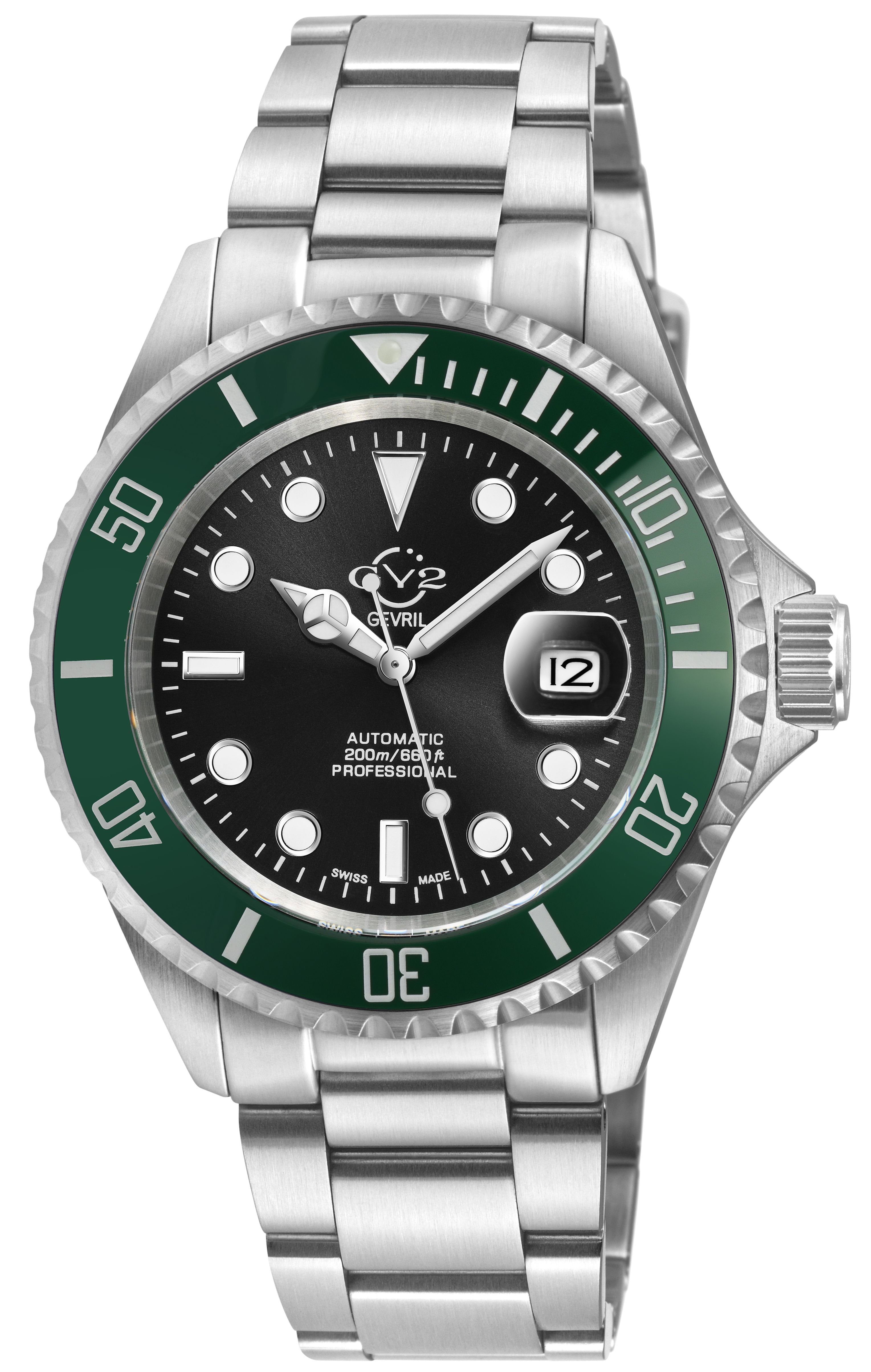 Stylish GV2 Liguria watch for men, featuring a 316L stainless steel case, green bezel, and black dial. Ideal for a professional and sporty look.
