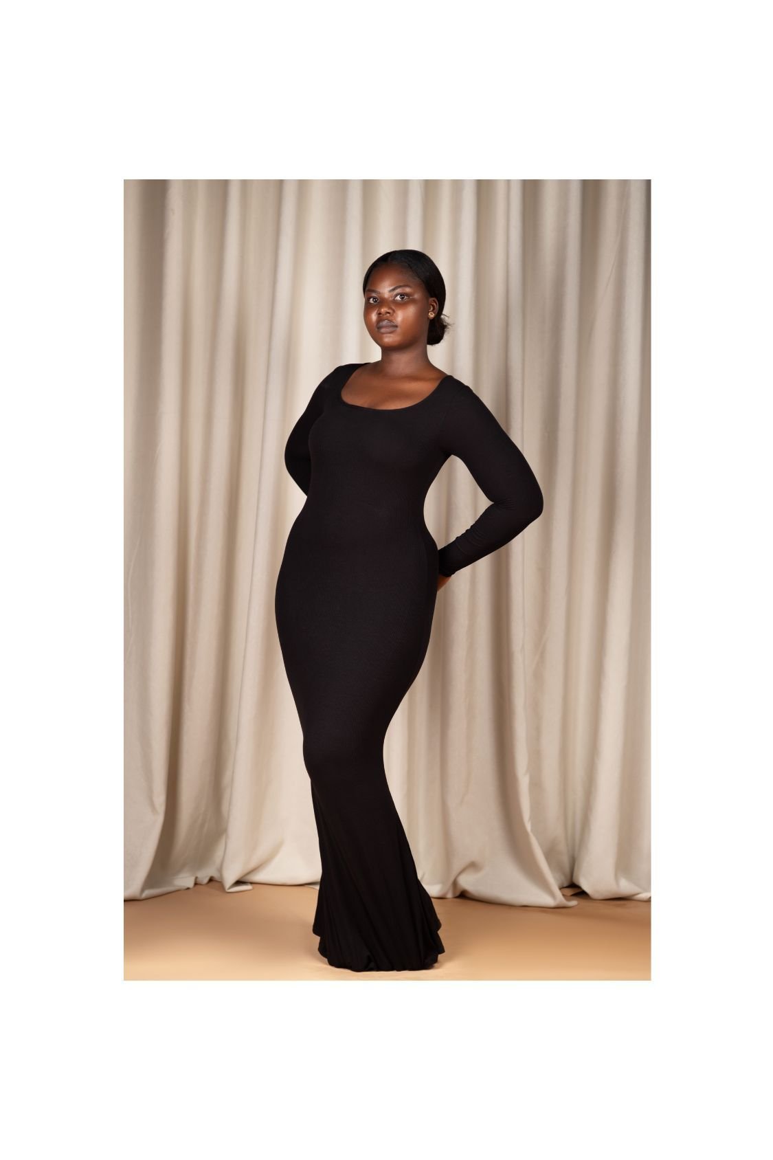 Stylish maxi dress in black with built-in shapewear for a flattering silhouette. Features long sleeves and a ribbed tummy control design for a sleek look.
