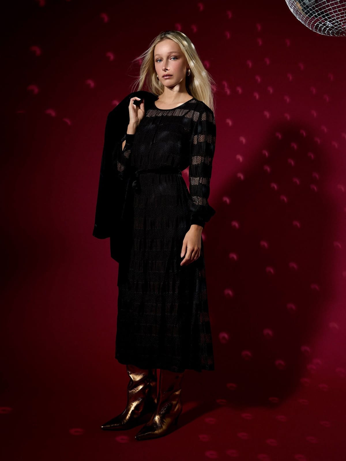 Elegant black jersey lace midi dress with a softly rounded neckline and long, semi-sheer sleeves. The velvet waist belt adds a touch of luxury. Ideal for evening events or special occasions.