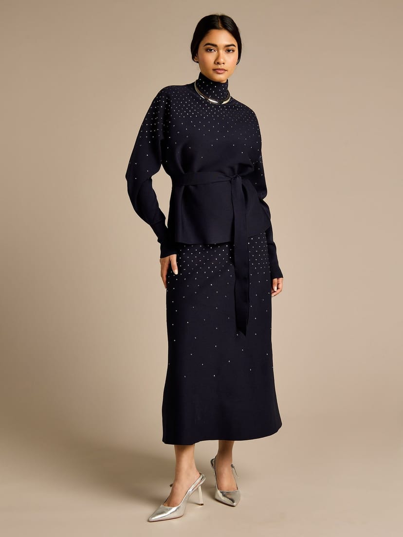 See all outfit ideasEffortlessly elegant, the GWD by GEORGE W. DAVIES Sparkle Iris Knitted Navy Skirt offers an A-line silhouette with delicate silver studs that catch the light beautifully. This skirt is perfect for work or evening outings, providing a versatile piece that transitions seamlessly from day to night.