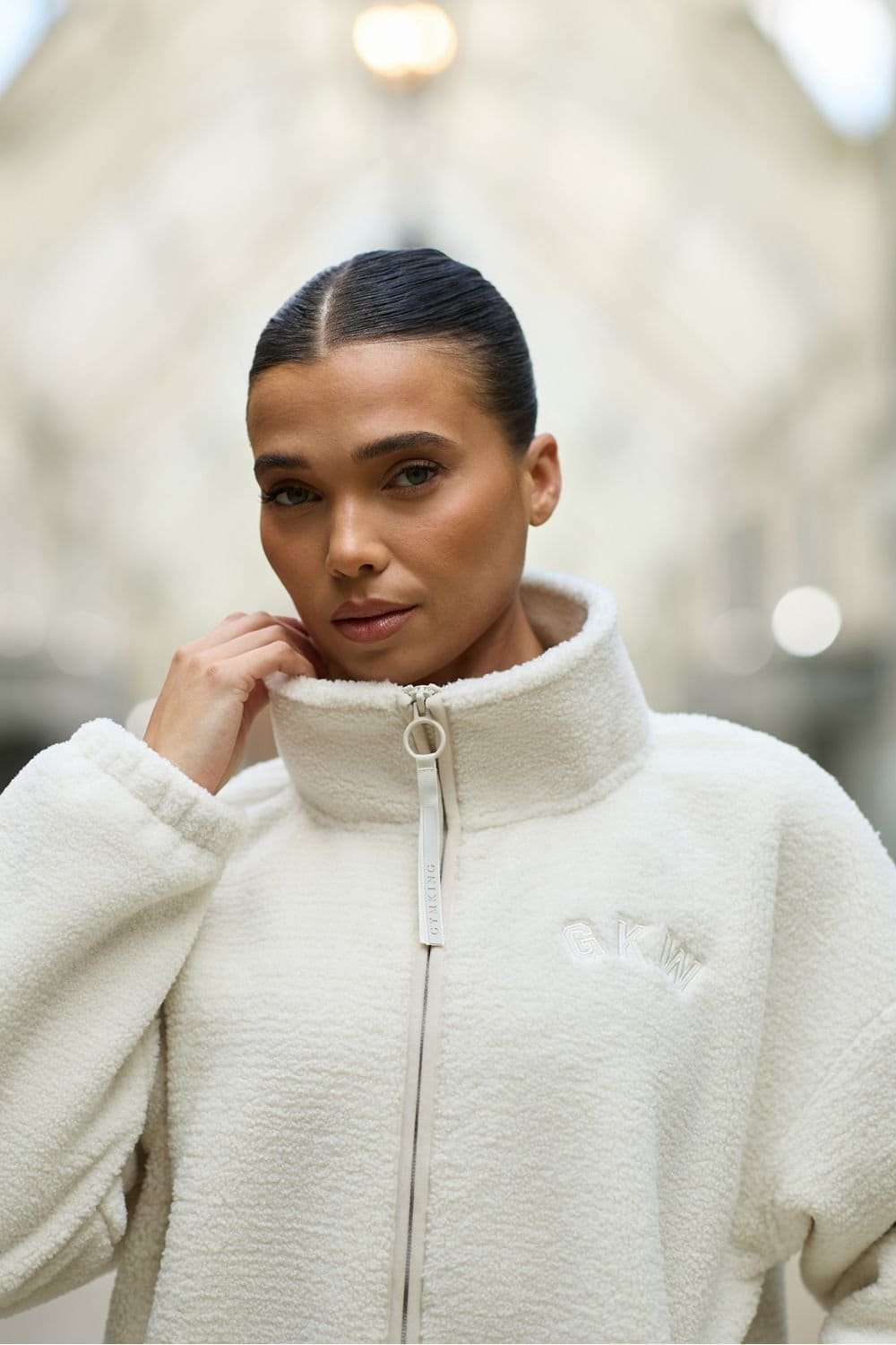 Luxuriously soft borg fabric for exceptional comfort and warmth. Full zip design with distinctive ring pull for easy wear. High collar silhouette offering additional neck protection against the elements. Relaxed fit with dropped shoulders for effortless movement. Subtle GYM KING embroidered logo detail.