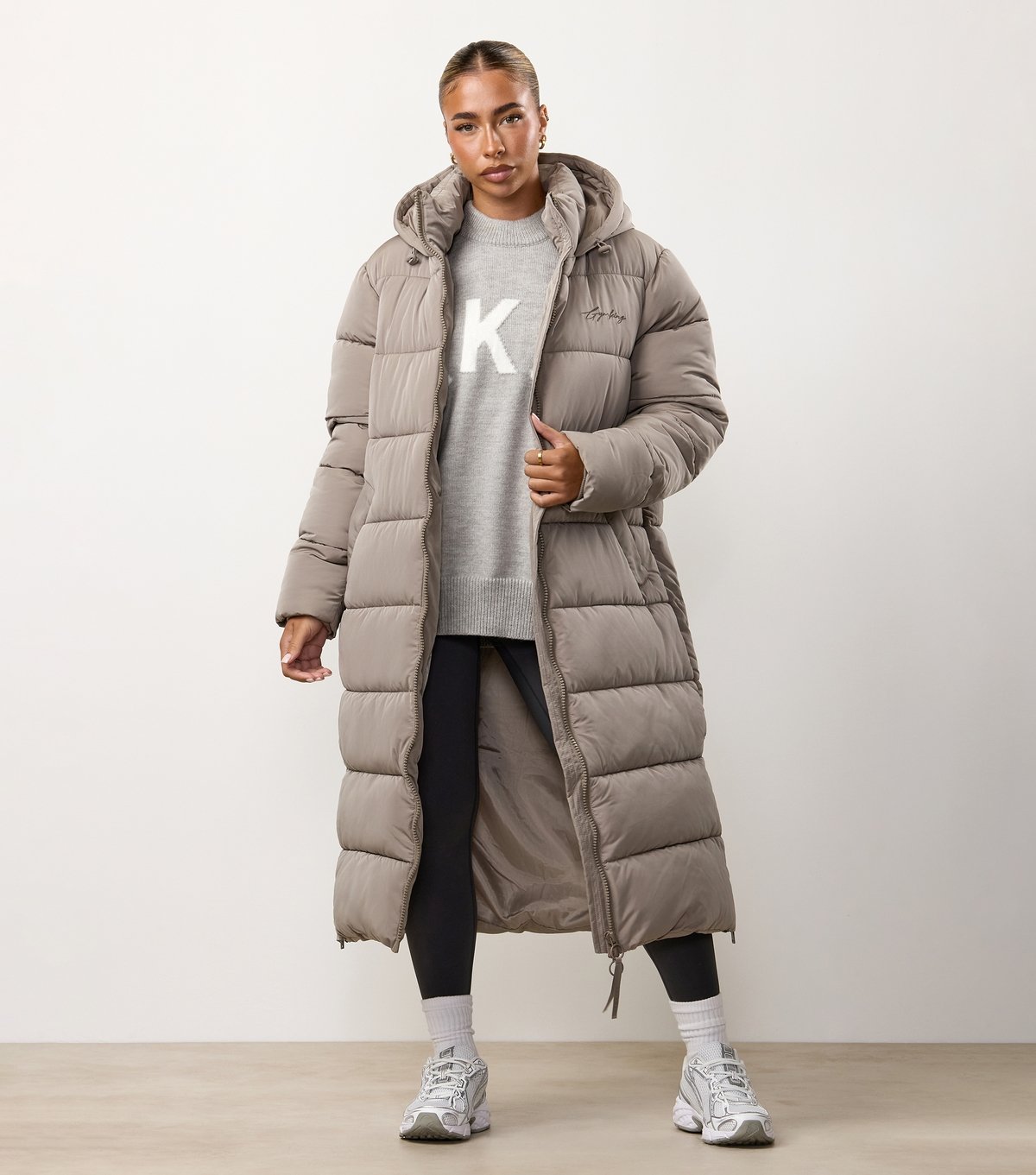 The Gym King Light Brown Longline Puffer Jacket is available in sizes 10, 12, 14, 16.