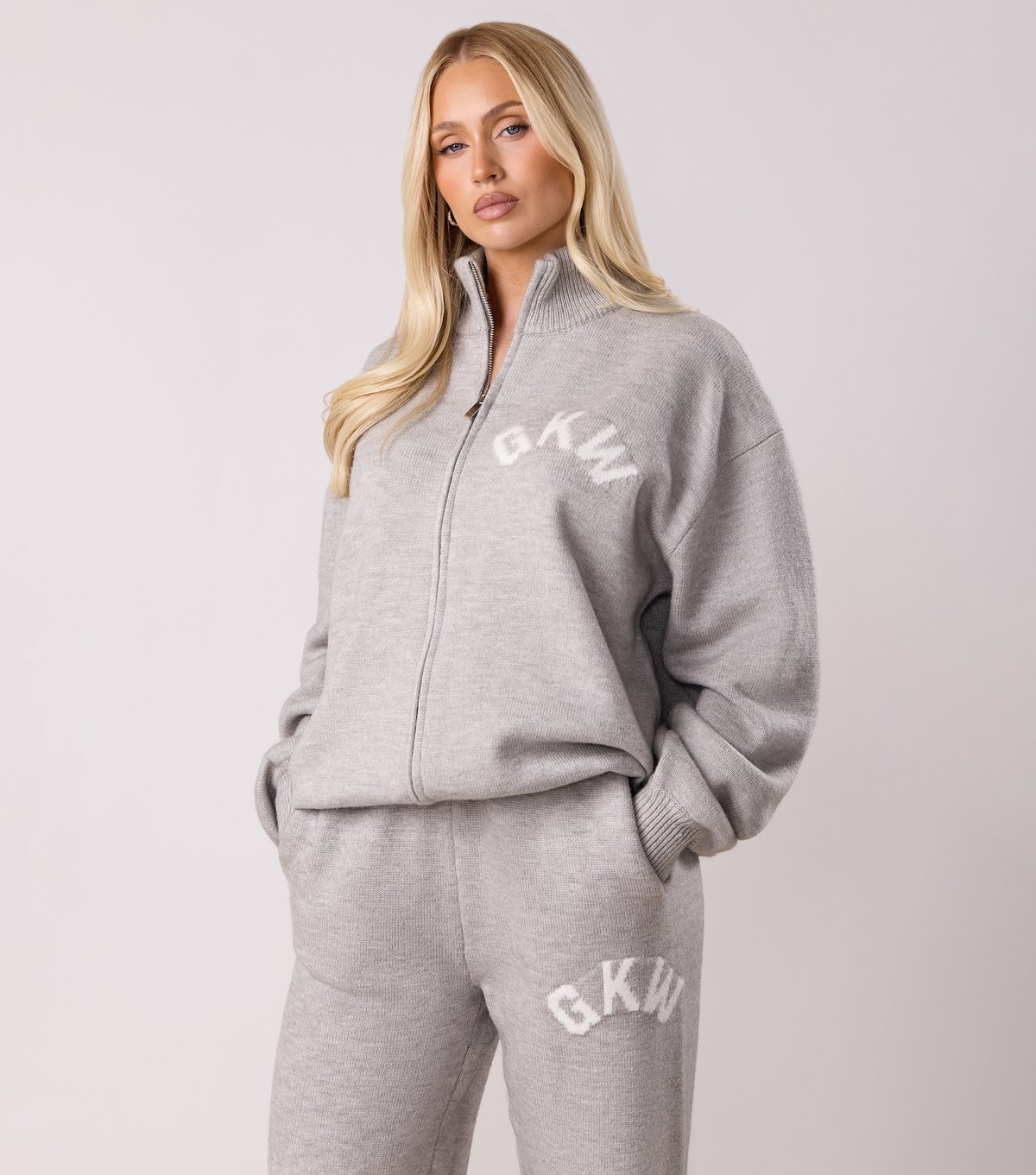 The Gym King Pale Grey Knit Full Zip Jumper is available in sizes 10, 12, 14, 16, 18, 6, 8.