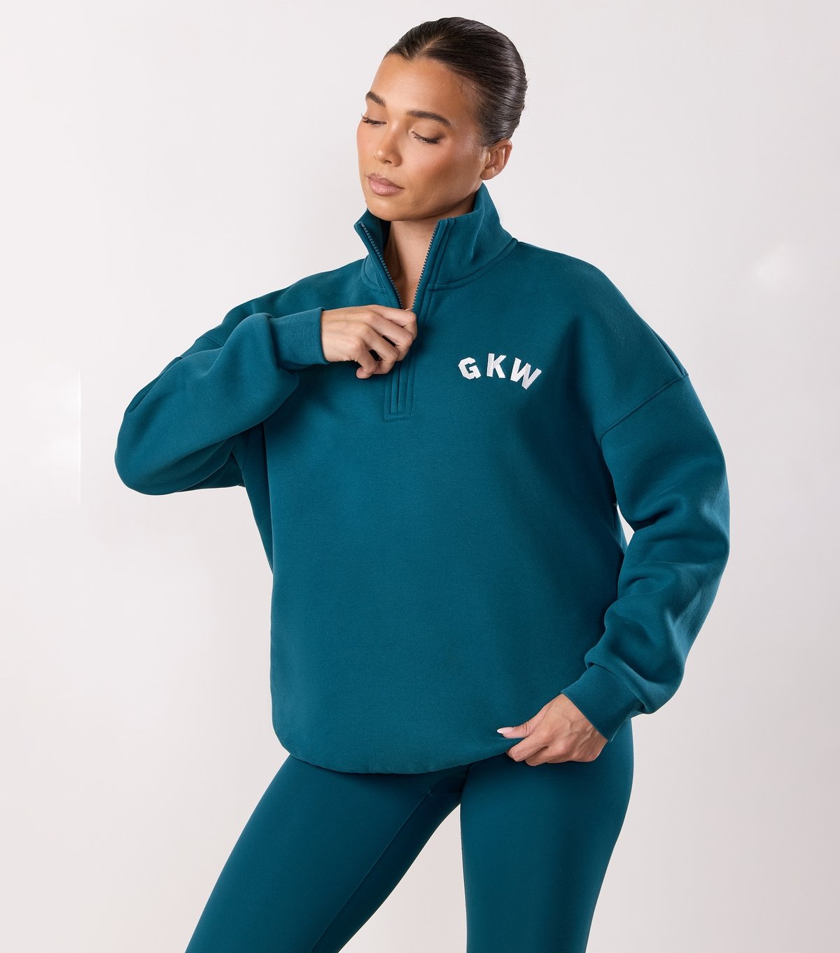 Sporty teal funnel neck zip-up from Gym King. Made from jersey fabric, this oversized sweatshirt features a fun teal colour and a GKW logo. Ideal for casual wear or gym sessions.