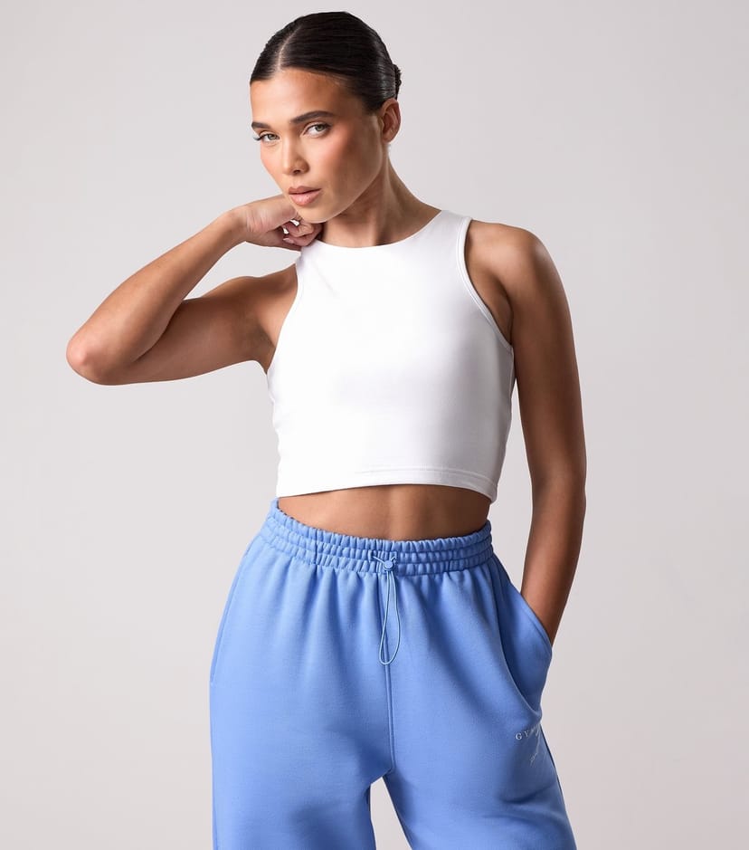 Stylish white cropped vest from Gym King featuring a twisted cut-out back and a raised logo. Made from jersey fabric for a slim fit, this piece is perfect for activewear or casual outings.