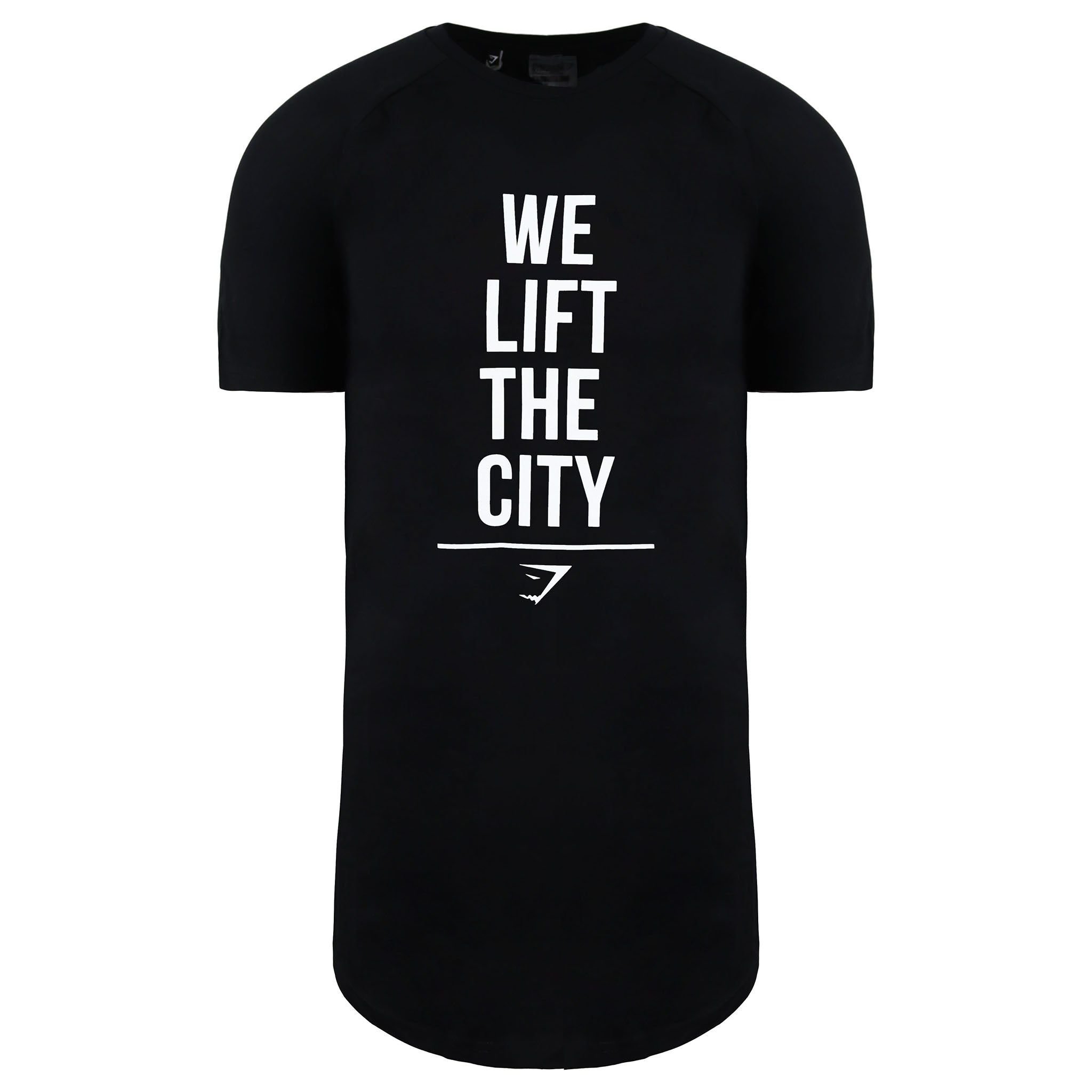 Sleek black Gymshark T-shirt with a modern, elongated silhouette and bold typography. Designed for comfort and performance, perfect for athleisure wear.