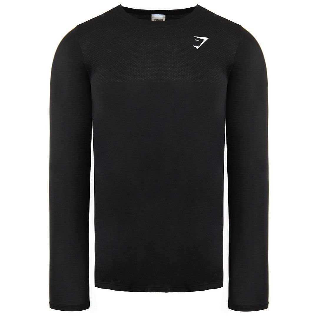 Sleek black long-sleeve crew neck top from Gymshark, designed for comfort and performance. Made from moisture-wicking fabric with a textured pattern for breathability and durability. Ideal for active wear and casual outings.