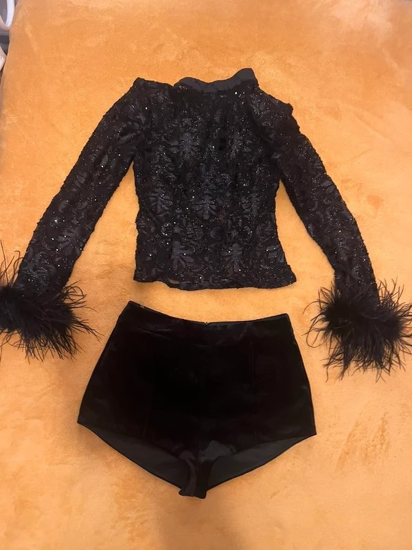 The Gypsabella Black Sequin Feather Top with Black Shorts is available in sizes M.