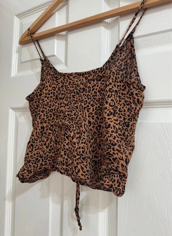 Leopard Print Ruched Crop Top from H&M - perfect for festivals, parties, or sunny days out. This lightweight top features an adjustable ruched front with tie detail and spaghetti straps for a bold look. Crafted from a blend of materials, it offers a comfortable and stylish fit. Ideal for adding a fierce touch to your summer wardrobe.
