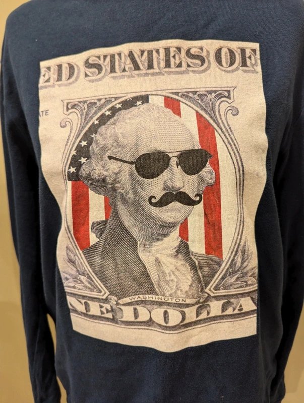 Navy blue sweatshirt from H&M features a unique logo of George Washington wearing sunglasses and a moustache. The long sleeves and crew neckline offer a relaxed fit.