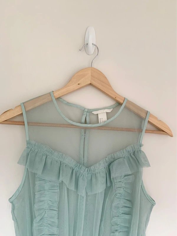 The H&M Mint Green Ruffled Tulle Sleeveless Blouse is available in sizes S.