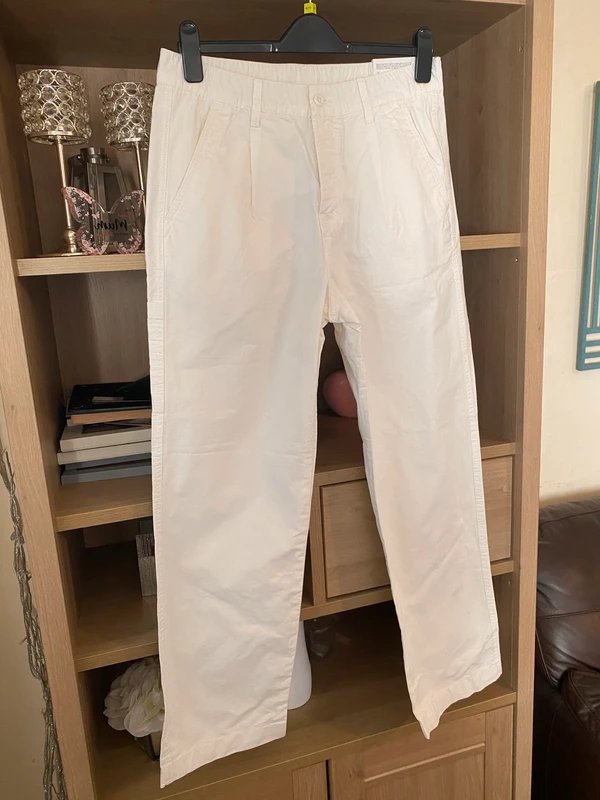 Nail the utility trend with these pristine white cargo trousers from H&M. Crafted from soft, breathable cotton, these trousers feature a relaxed wide-leg fit and an elasticated waist for ultimate comfort. They come equipped with a classic button fly, front pockets, and large functional side pockets for that authentic cargo look.