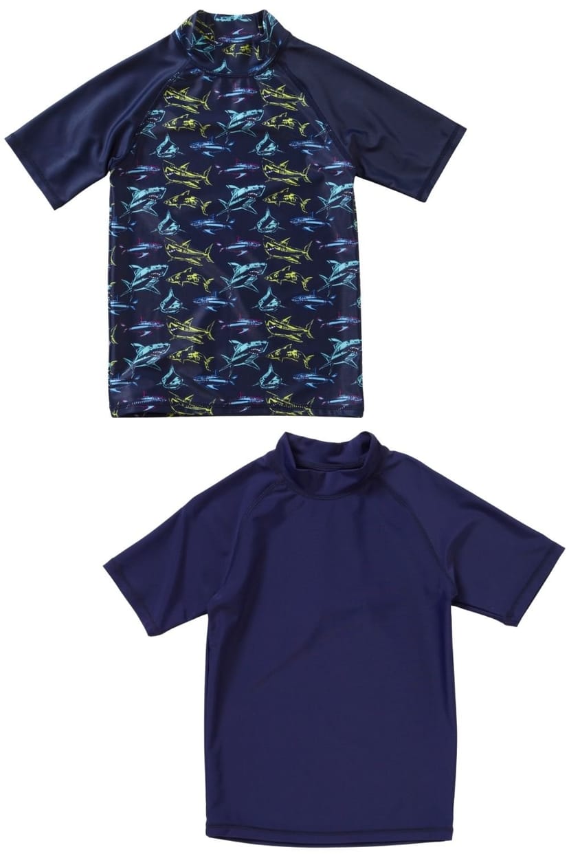 Two pack of navy swim rash tops with UPF50+ sun protection. Featuring short raglan sleeves and a crew neck, perfect for beach holidays or pool days. Made from quick-drying fabric.