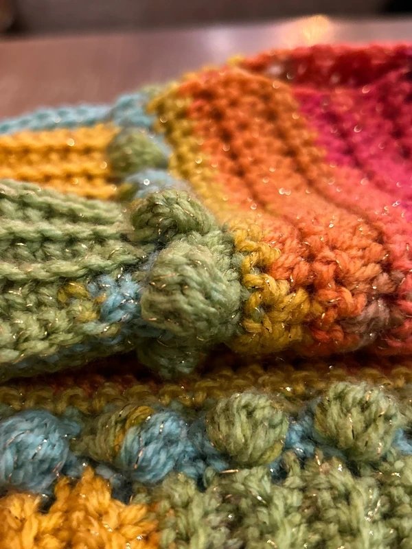 NEW STOCK: Warm and stylish, these fingerless mitts are crafted from acrylic double knit yarn with Papatya Batik glitter in vibrant rainbow shades. Cute bobbles adorn the cuff, making them perfect for adding a pop of colour to your winter wardrobe.