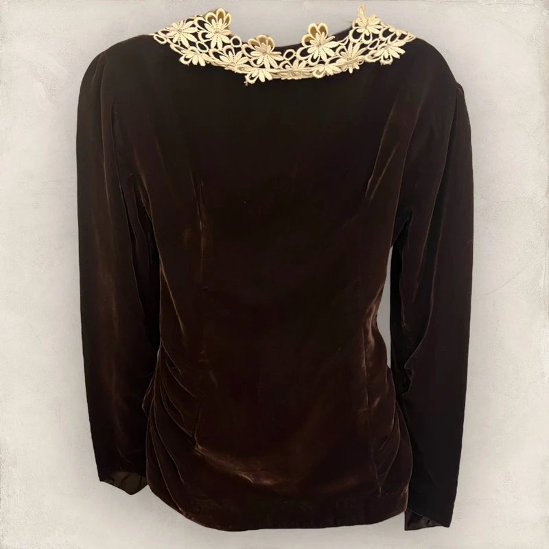 The Handmade Victoriana Brown Silk Velvet Blouse with Cream Appliques is available in sizes M.